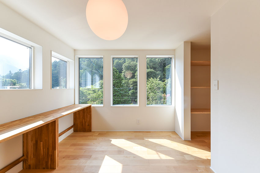 二階のファミリースペースからは、山と川を一望する伸びやかな景色。