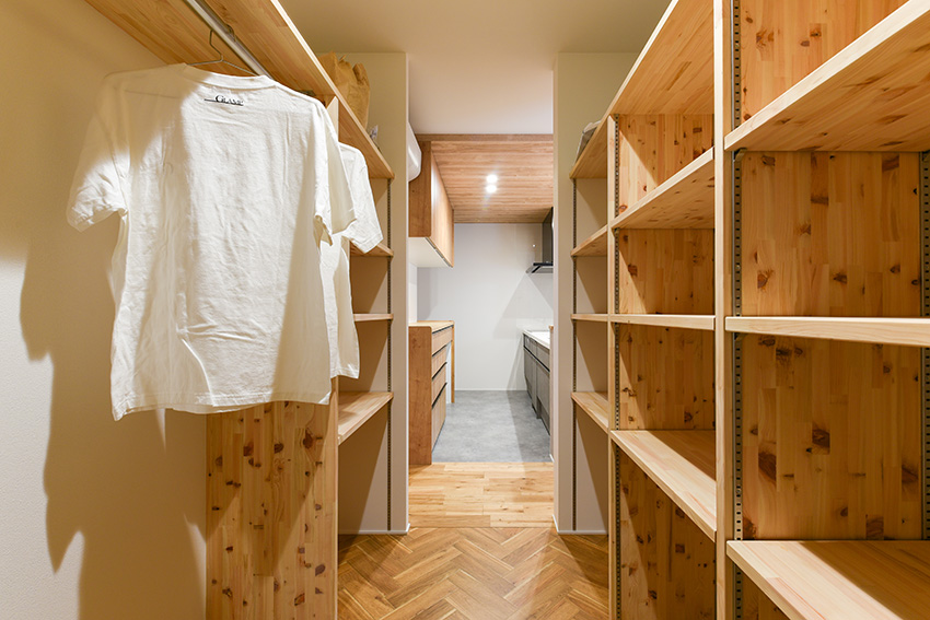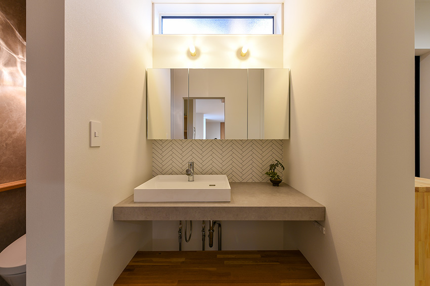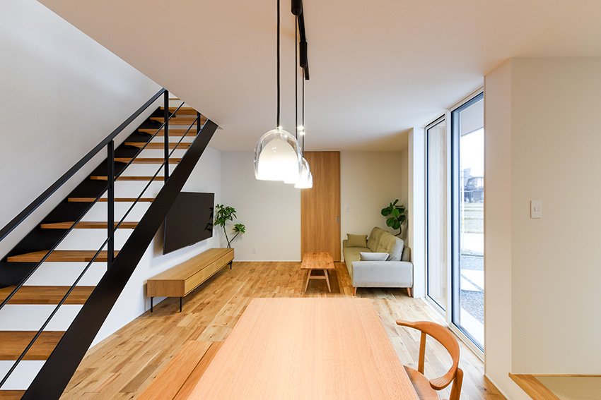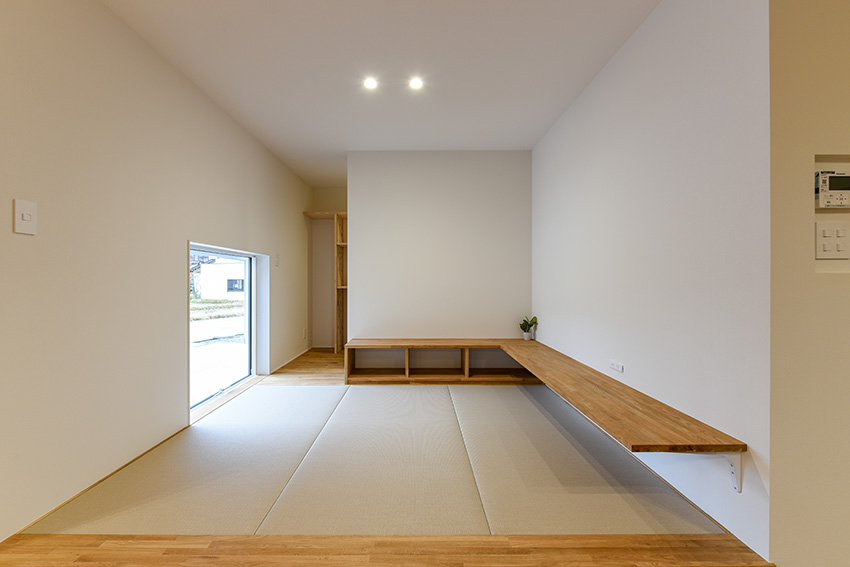 WORKS施工事例 「白と木の家」 CONCEPT 変形地という条件を、住まいの個性へと昇華した工夫ある間取り。 限られた形状の中に、視線の抜けと使いやすさを丁寧に重ねています。 生活のほとんどが一階で完結する構成は、 日々の動きを自然に整え、将来まで見据えた安心感をもたらします。 カウンタースペースと一体に設えた小上がり畳は、 仕事、学び、くつろぎがゆるやかにつながる場所。 暮らしの変化を受け止めながら、 家族それぞれの時間に寄り添い続けていきます。 WORKS一覧