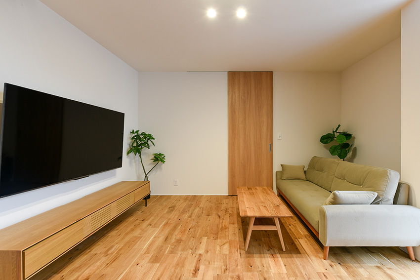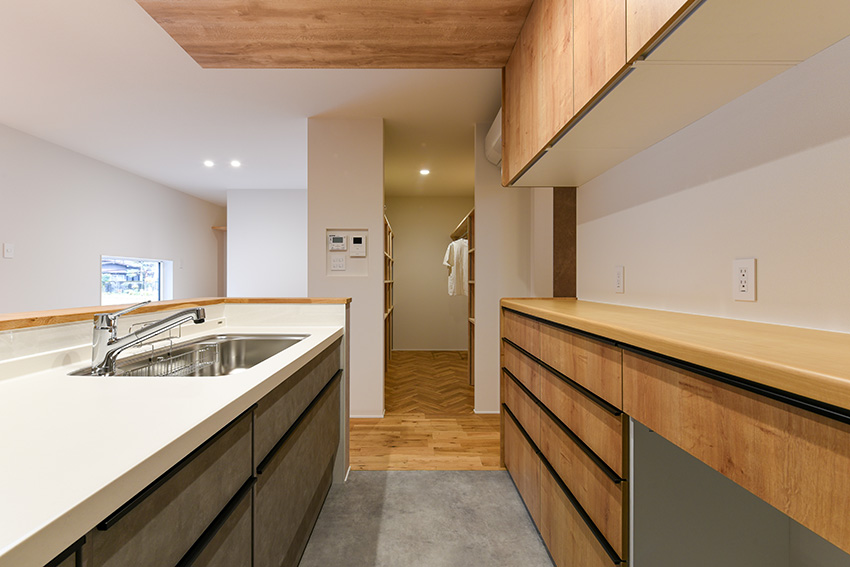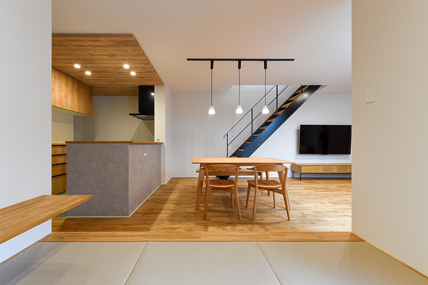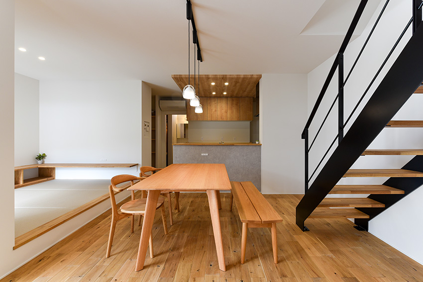 WORKS施工事例 「白と木の家」 CONCEPT 変形地という条件を、住まいの個性へと昇華した工夫ある間取り。 限られた形状の中に、視線の抜けと使いやすさを丁寧に重ねています。 生活のほとんどが一階で完結する構成は、 日々の動きを自然に整え、将来まで見据えた安心感をもたらします。 カウンタースペースと一体に設えた小上がり畳は、 仕事、学び、くつろぎがゆるやかにつながる場所。 暮らしの変化を受け止めながら、 家族それぞれの時間に寄り添い続けていきます。 WORKS一覧
